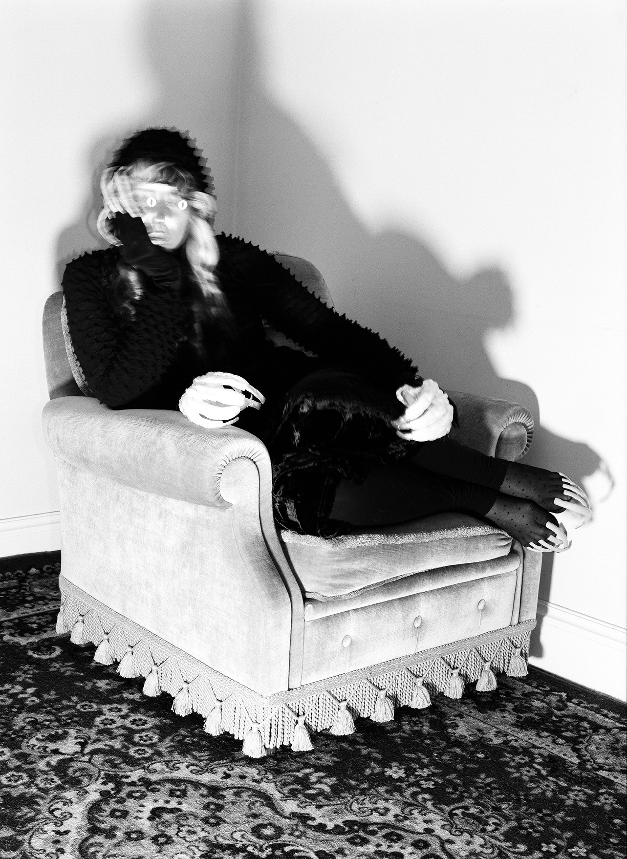 Photography, as a "haunted medium," plays a central role in her work, preserving traces of the past while shaping imagined futures. Through analogue and experimental techniques such as chemigrams, she investigates the materiality of the photographic image. From self-portraits to staged compositions, her process is deeply hands-on, involving set construction, object-making, and direct engagement with physical materials.